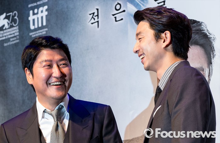 (서울=포커스뉴스) 배우 송강호(왼쪽), 공유가 4일 오전 서울 강남구 압구정 CGV에서 열린 영화 '밀정' 제작보고회에 참석해 포즈를 취하고 있다. 배우 송강호, 공유, 한지민, 엄태구, 신성록 등이 출연하는 영화 '밀정'은 일제 강점기 무장독립단체 의열단과 일본 경찰 간의 암투를 그린 작품으로 오는 9월 개봉 예정이다.