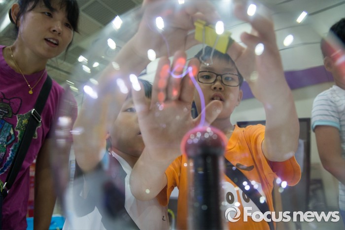 (서울=포커스뉴스) 4일 오전 서울 강남구 코엑스에서 열린 '제20회 대한민국 과학창의축전'을 찾은 시민들이 플라즈마볼을 만지고 있다.