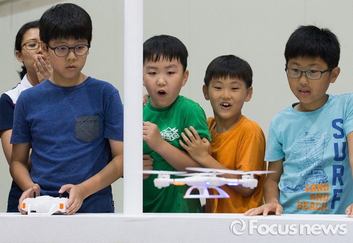 (서울=포커스뉴스) 4일 오전 서울 강남구 코엑스에서 열린 '제20회 대한민국 과학창의축전'을 찾은 시민들이 드론 조종 체험을 하고 있다.