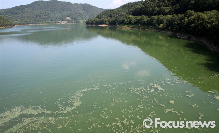 (청주=포커스뉴스) 폭염이 이어지면서 대청호 수역에 조류경보 '관심' 단계가 내려진 가운데 4일 오후 충북 청주시 상당구 문의대교 인근 대청호에 녹조가 형성돼 있다.