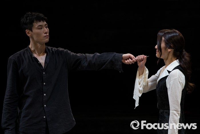 (서울=포커스뉴스) 4일 오후 서울 중구 충무아트센터에서 열린 연극 '햄릿-더 플레이' 언론시연회에 참석한 배우 김동원(왼쪽), 서태영이 열연하고 있다.