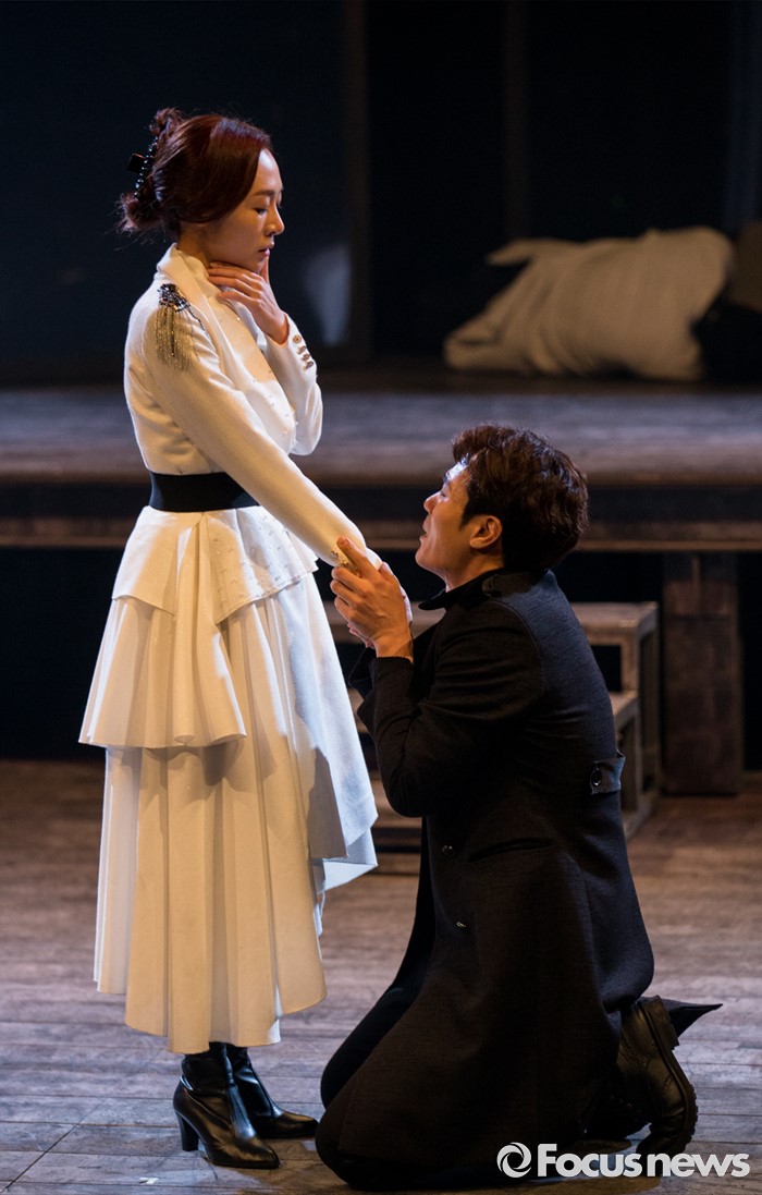 (서울=포커스뉴스) 4일 오후 서울 중구 충무아트센터에서 열린 연극 '햄릿-더 플레이' 언론시연회에 참석한 배우 김강우(오른쪽), 이진희가 열연하고 있다.