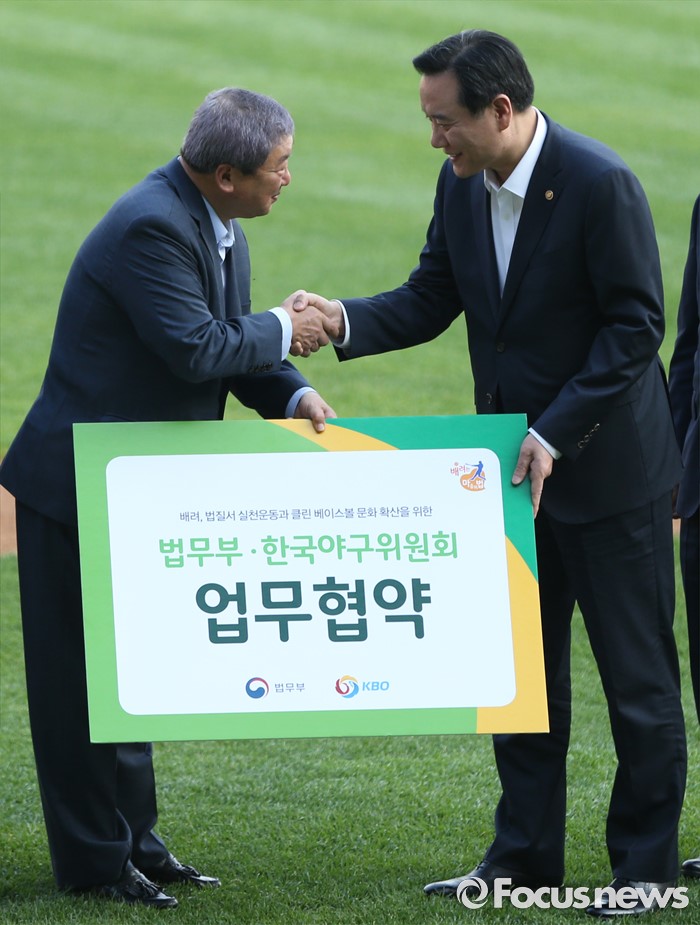 한편 KBO는 지난달 22일 실행위원회 회의에서 정한 12일까지 자진신고 이후 부정행위가 밝혀진 사안은 무관용 원칙에 따라 영구 실격 처리할 방침이다.(서울=포커스뉴스) 31일 서울 잠실구장에서 열린 2016 프로야구 KIA-LG 경기에 앞서 한국야구위원회(KBO)와 법무부 사이에 클린베이스볼문화확산을 위한 업무협약을 가졌다. 김현웅 법무부 장관(오른쪽)과 구본능 KBO총재가 협약을 마친 후 악수하고 있다.2016.05.31 우정식 기자