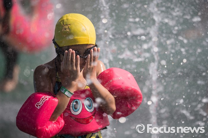 (서울=포커스뉴스) 서울에 첫 폭염경보가 내려진 4일 오후 서울 서초구 양재시민의숲 내 양재천 수영장을 한 아이가 물놀이를 하고 있다.