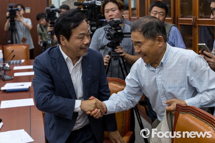 (서울=포커스뉴스) 국회 농해수위 부정청탁금지법 소위 위원장인 황주홍(오른쪽) 국민의당 의원과 이완영 새누리당 의원이 4일 오후 서울 여의도 국회에서 열린 농림축산식품해양수산위원회 부정청탁금지법 관련 소위에 참석해 악수 하고 있다.