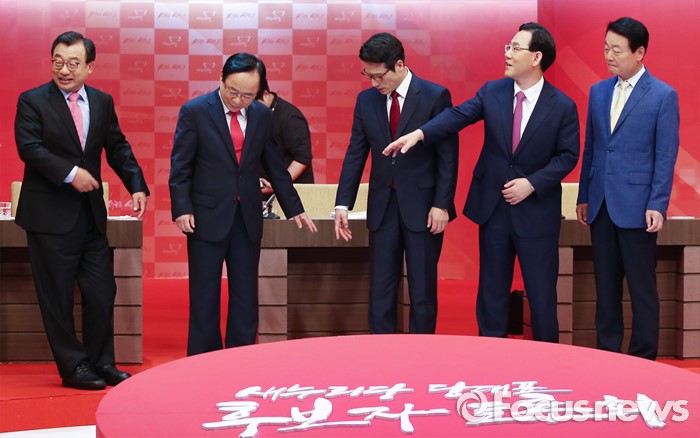 (서울=포커스뉴스) 4일 오후 서울 강서구 등촌동 SBS공개홀에서 새누리당 대표 경선 4차 TV토론회을 마친 의원들이 포즈를 취하기 위해 준비하고 있다. 오른쪽부터 한선교, 주호영, 정병국, 이주영, 이정현 의원.