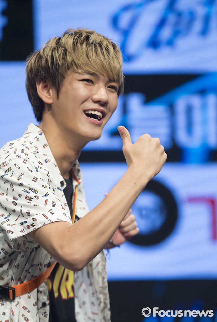 (서울=포커스뉴스) 4일 오후 서울 강남구 일지아트홀에서 열린 아이돌 그룹 업텐션의 미니앨범 'Summer go'발표 쇼케이스에 참석한 멤버 환희가 포토타임을 갖고 있다.