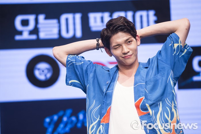 (서울=포커스뉴스) 4일 오후 서울 강남구 일지아트홀에서 열린 아이돌 그룹 업텐션의 미니앨범 'Summer go'발표 쇼케이스에 참석한 멤버 쿤이 포토타임을 갖고 있다.