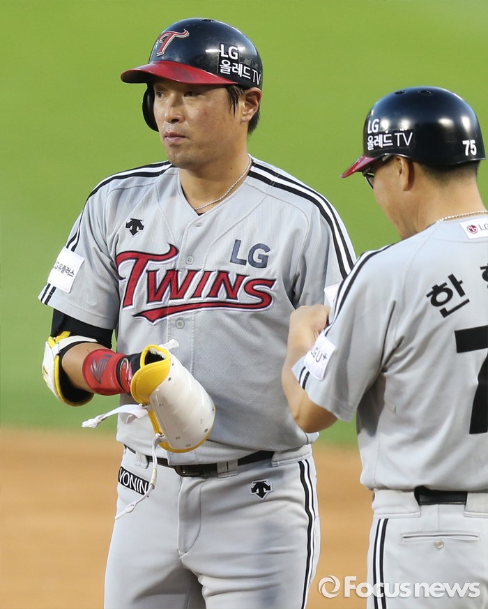 (서울=포커스뉴스) 4일 서울 잠실구장에서 열린 2016 프로야구 LG-두산 경기 4회초 1사 3루에서 LG 임훈이 중전 적시타를 치고 1루에서 한혁수 코치의 축하를 받고 있다.