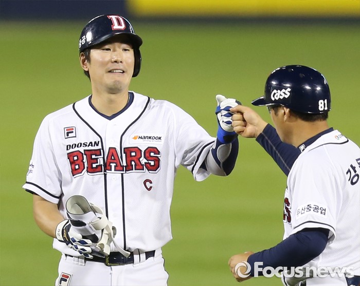 (서울=포커스뉴스) 4일 서울 잠실구장에서 열린 2016 프로야구 LG-두산 경기 6회말 2사 3루에서 두산 김재호가 우익수를 넘기는 1타점 2루타를 치고 강동우 코치와 주먹을 마주치고 있다.
