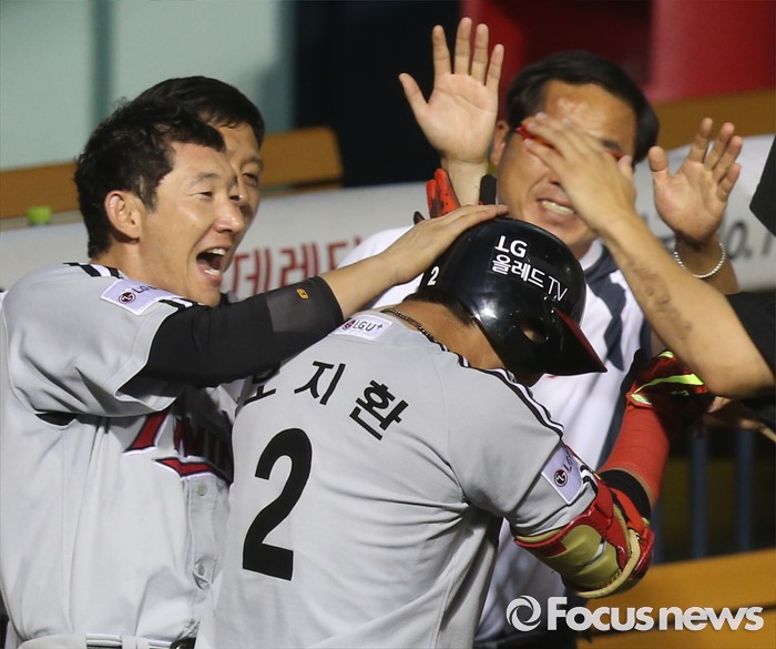 (서울=포커스뉴스) 4일 서울 잠실구장에서 열린 2016 프로야구 LG-두산 경기 연장 10회초 1사후 LG 오지환이 좌월 솔로 홈런을 치고 더그아웃에서 손주인을 비롯한 동료들의 열렬한 환영을 받고 있다.