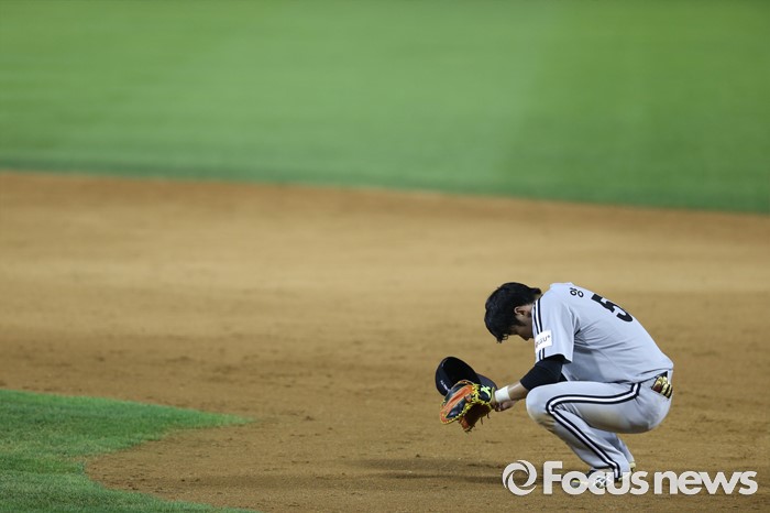 (서울=포커스뉴스) 4일 서울 잠실구장에서 열린 2016 프로야구 LG-두산 경기 연장 10회말 1사 만루에서 LG 1루수 양석환이 투수 교체하는 동안 그라운드에 쪼그려 앉아 기다리고 있다.