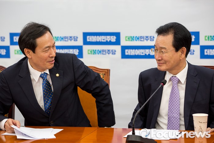 (서울=포커스뉴스) 우상호(왼쪽) 더불어민주당 원내대표와 변재일 정책위의장이 5일 오전 서울 여의도 국회에서 열린 상임위원회 간사단 간담회에 참석해 대화 하고 있다.