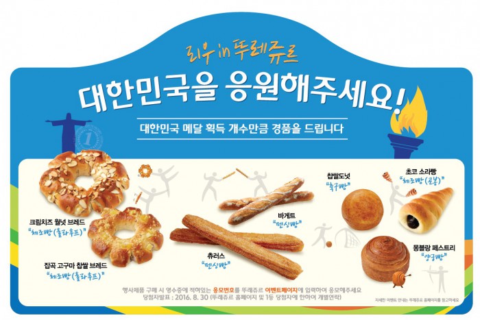 뚜레쥬르 관계자는 "대한민국을 응원하는 마음을 고객과 함께 하고자 이 같은 이벤트를 기획했다"며 "승리를 기원하는 '국가대표 빵'도 먹고, 푸짐한 경품 혜택도 누리기 바란다"고 말했다.2016.08.05 <사진제공=CJ푸드빌>