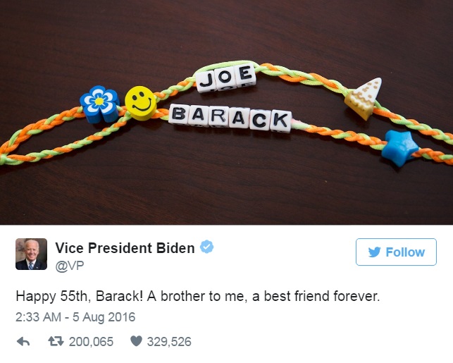 조 바이든 부통령은 자신의 트위터 계정을 통해 "55번째 생일을 축하한다. 나의 영원한 친구여"라는 글을 남기며 오바마 대통령의 생일을 축하했다. 바이든 부통령은 그의 이름 '조(Joe)'와 오바마 대통령의 이름 '버락(Barack)'이 새겨진 팔찌 사진을 게재하며 우정을 과시했다.