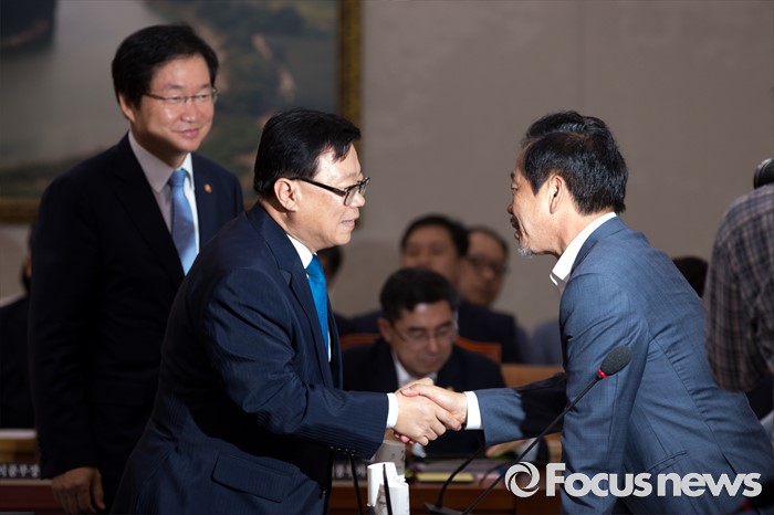(서울=포커스뉴스) 이완영(오른쪽) 새누리당 의원과 이동필(가운데) 농림축산식품부 장관이 5일 오전 서울 여의도 국회에서 열린 국회 농림축산식품해양수산위원회 전체회의에 참석해 악수 하고 있다.