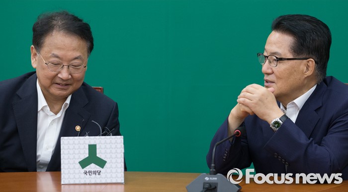 (서울=포커스뉴스) 5일 오전 서울 여의도 국회에서 추경 예산 등 협조를 위해 방문한 유일호(왼쪽) 경제부총리 겸 기획재정부 장관과 박지원 국민의당 비상대책위원장이 면담을 하고 있다.