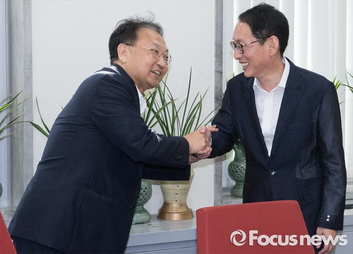(서울=포커스뉴스) 5일 오전 서울 여의도 국회에서 추경 예산 등 협조를 위해 방문한 유일호(왼쪽) 경제부총리 겸 기획재정부 장관이 김도읍 새누리당 원내수석부대표와 인사하고 있다.