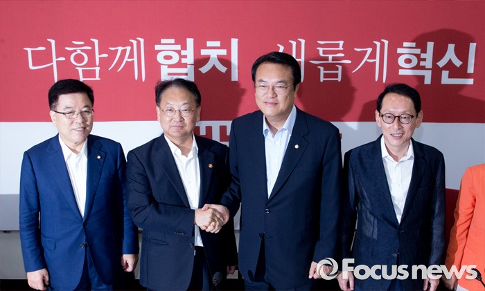 (서울=포커스뉴스) 5일 오전 서울 여의도 국회에서 추경 예산 등 협조를 위해 방문한 유일호 경제부총리 겸 기획재정부 장관이 새누리당 원내지도부와 인사하고 있다. 왼쪽부터 김광림 새누리당 정책위의장, 유 부총리, 정진석 새누리당 원내대표, 김도읍 원내수석부대표.