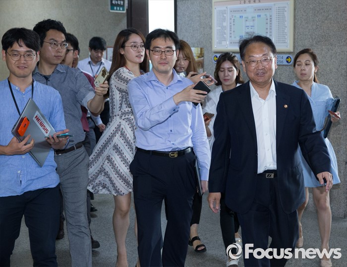 | △ 취재진과 함께 이동하는 경제부총리 |