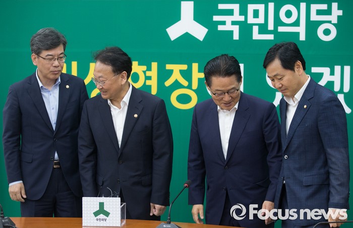 (서울=포커스뉴스) 5일 오전 서울 여의도 국회에서 추경 예산 등 협조를 위해 방문한 유일호(왼쪽 두번째) 경제부총리 겸 기획재정부 장관, 송언석(왼쪽 첫번째) 2차관이 박지원(오른쪽 두번째) 국민의당 비상대책위원장, 김관영 원내수석부대표와 인사한 뒤 자리에 앉고 있다.