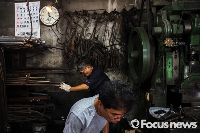 (서울=포커스뉴스) 서울이 낮 최고 36도를 기록하는 등 전국적으로 불볕더위가 기승을 부리는 5일 오전 서울 은평구 수색동에 위치한 형제대장간에서 류상준( 63), 류상남(59)씨가 화덕 앞에서 건설용 공구를 만드는 작업을 하고 있다.