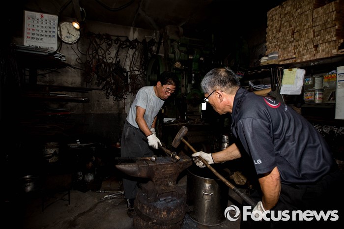 (서울=포커스뉴스) 서울이 낮 최고 36도를 기록하는 등 전국적으로 불볕더위가 기승을 부리는 5일 오전 서울 은평구 수색동에 위치한 형제대장간에서 류상준(왼쪽, 63), 류상남(59)씨가 화덕 앞에서 건설용 공구를 만드는 작업을 하고 있다.