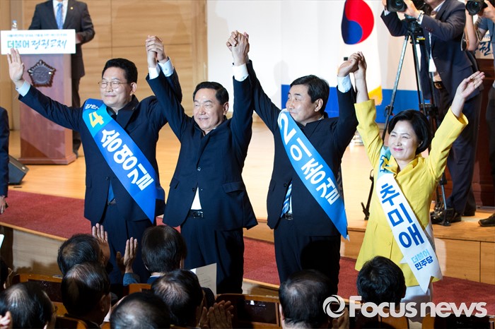 (서울=포커스뉴스) 더불어민주당 전당대회 당대표에 출마한 후보들이 5일 오후 서울 여의도 국회의원회관에서 열린 '전당대회 당대표 예비경선(컷오프)'에 참석해 정견발표에 앞서 손을 잡고 사진촬영을 하고 있다. 왼쪽부터 송영길 후보, 김상곤 후보, 이종걸 후보, 추미애 후보.