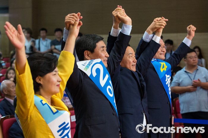 (서울=포커스뉴스) 더불어민주당 전당대회 당대표에 출마한 후보들이 5일 오후 서울 여의도 국회의원회관에서 열린 '전당대회 당대표 예비경선(컷오프)'에 참석해 정견발표에 앞서 손을 잡고 사진촬영을 하고 있다. 오른쪽부터 송영길 후보, 김상곤 후보, 이종걸 후보, 추미애 후보.