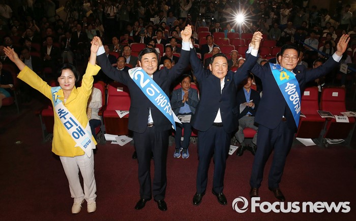 (서울=포커스뉴스) 더불어민주당 전당대회 당대표에 출마한 후보들이 5일 오후 서울 여의도 국회의원회관에서 열린 '전당대회 당대표 예비경선(컷오프)'에 참석해 정견발표에 앞서 손을 잡고 사진촬영을 하고 있다. 오른쪽부터 송영길 후보, 김상곤 후보, 이종걸 후보, 추미애 후보.