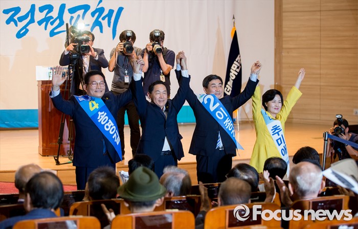 (서울=포커스뉴스) 5일 오후 서울 여의도 국회 의원회관에서 열린 더불어민주당 당대표 선출을 위한 예비경선대회에 참석한 송영길(왼쪽부터), 김상곤, 이종걸, 추미애 당대표 후보가 손을 들어 인사하고 있다.
