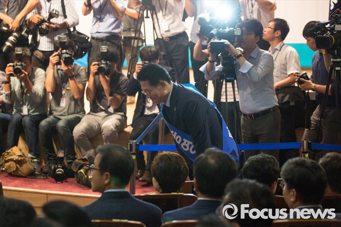 (서울=포커스뉴스) 더불어민주당 전당대회 당 대표에 출마한 송영길 의원이 5일 오후 서울 여의도 국회의원회관에서 열린 '전당대회 당대표 예비경선(컷오프)'에 참석해 인사 하고 있다.