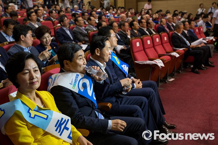 (서울=포커스뉴스) 더불어민주당 전당대회 당대표에 출마한 후보들이 5일 오후 서울 여의도 국회의원회관에서 열린 '전당대회 당대표 예비경선(컷오프)'에 참석해 정견발표를 기다리고 있다. 왼쪽부터 추미애 후보, 이종걸 후보, 김상곤 후보, 송영길 후보.