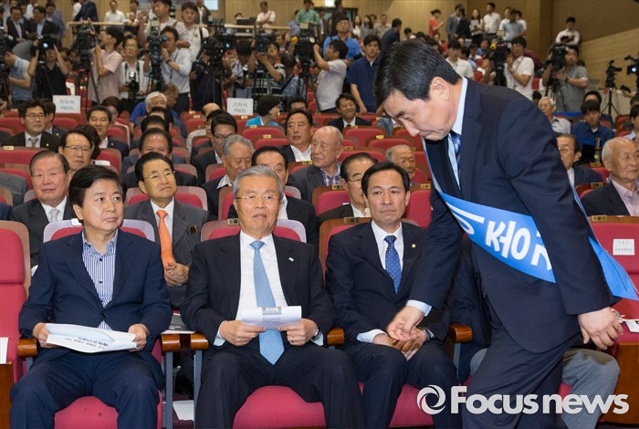 (서울=포커스뉴스) 5일 오후 서울 여의도 국회 의원회관에서 열린 더불어민주당 당대표 선출을 위한 예비경선대회에 참석한 이종걸 당대표 후보가 참석자들과 인사한 뒤 자리로 향하고 있다. 오른쪽부터 이 후보, 우상호 원내대표, 김종인 비대위 대표, 노웅래 선거관리위원장.