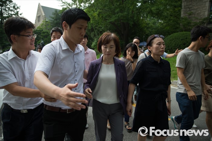 (서울=포커스뉴스) 최경희(앞줄 왼쪽 세번째) 이화여대 총장이 5일 오후 서울 서대문구 이화여대 본관을 점거농성 중인 학생들과 대화를 위해 방문했으나 만나지 못하고 돌아가고 있다. 이날 최경희 이화여대 총장은 대학 본관 점거농성 중 교수·교직원 감금 혐의를 받고 있는 학생들의 처벌을 원치 않는다며 탄원서를 경찰에 제출했고, 농성 중인 이화여대 학생들은 “이중적 행동”이라며 최 총장의 사퇴를 거듭 촉구했다.