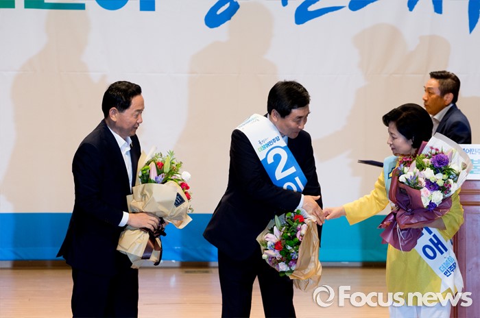 (서울=포커스뉴스) 5일 오후 서울 여의도 국회 의원회관에서 더불어민주당 당대표 선출을 위한 예비경선대회를 마친 김상곤(왼쪽부터), 이종걸, 추미애 당대표 후보가 인사하고 있다.