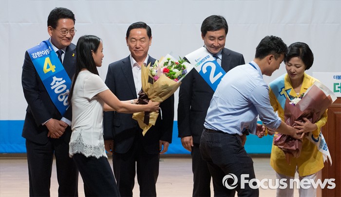 (서울=포커스뉴스) 5일 오후 서울 여의도 국회 의원회관에서 열린 더불어민주당 당대표 선출을 위한 예비경선대회에 참석한 송영길(왼쪽부터), 김상곤, 이종걸, 추미애 당대표 후보가 당직자들로부터 꽃다발을 받고 있다. 이날 경선에서는 송영길 당대표 후보가 탈락했다.
