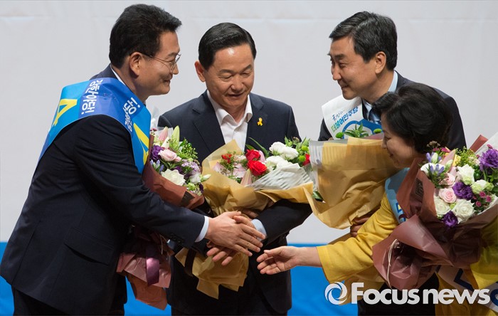 (서울=포커스뉴스) 5일 오후 서울 여의도 국회 의원회관에서 열린 더불어민주당 당대표 선출을 위한 예비경선대회에 참석한 송영길 당대표 후보가 경선 탈락 후 경선 통과한 동료 후보들을 축하해주고 있다. 왼쪽부터 송 후보, 김상곤, 이종걸, 추미애 당대표 후보.