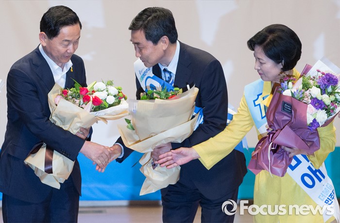 (서울=포커스뉴스) 5일 오후 서울 여의도 국회 의원회관에서 열린 더불어민주당 당대표 선출을 위한 예비경선대회에 참석한 추미애(오른쪽부터), 이종걸, 김상곤 당대표 후보가 경선 통과 후 악수하고 있다.