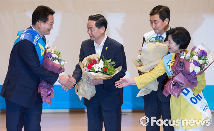 (서울=포커스뉴스) 5일 오후 서울 여의도 국회 의원회관에서 열린 더불어민주당 당대표 선출을 위한 예비경선대회에 참석한 송영길 당대표 후보가 경선 탈락 후 경선 통과한 동료 후보들을 축하해주고 있다. 왼쪽부터 송 후보, 김상곤, 이종걸, 추미애 당대표 후보.