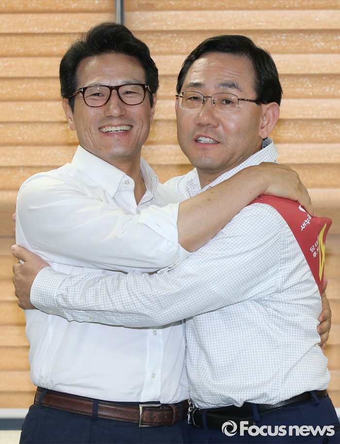 (천안=포커스뉴스) 새누리당 전당대회를 4일 앞두고 5일 오후 충남 천안 유관순체육관에서 충청권 합동연설회를 마치고 비박계 당권주자들의 2차 단일화에서 주호영(오른쪽) 후보가 단일 후보로 결정 됐다. 정병국 후보와 주호영 후보가 포옹을 하고 있다.