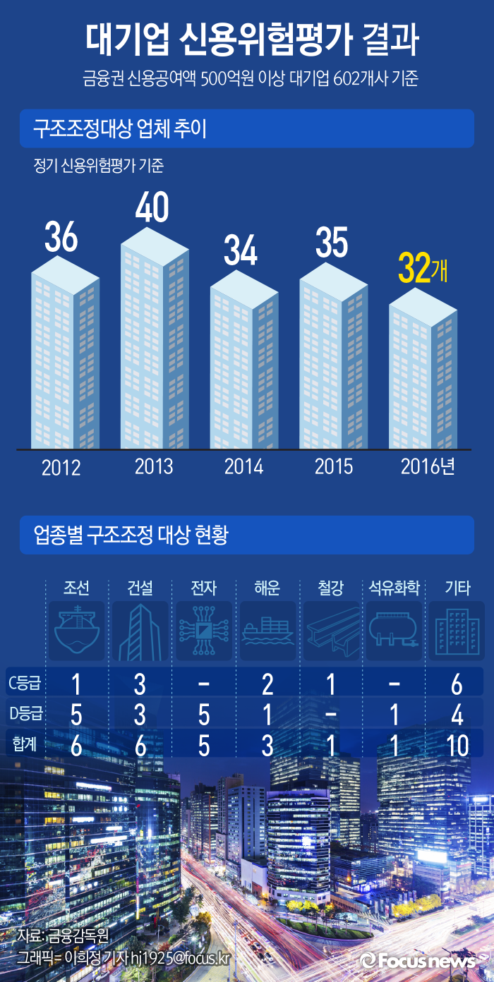 (서울=포커스뉴스) 7일 금융감독원이 발표한 ‘2016년 대기업 정기 신용위험평가’에 따르면 구조조정 대상으로 총 32개 업체가 확정됐다. 업종별로는 조선·건설·해운·철강·석유화학 등 취약업종 기업이 구조조정대상 절반이상(53%)을 차지했다.