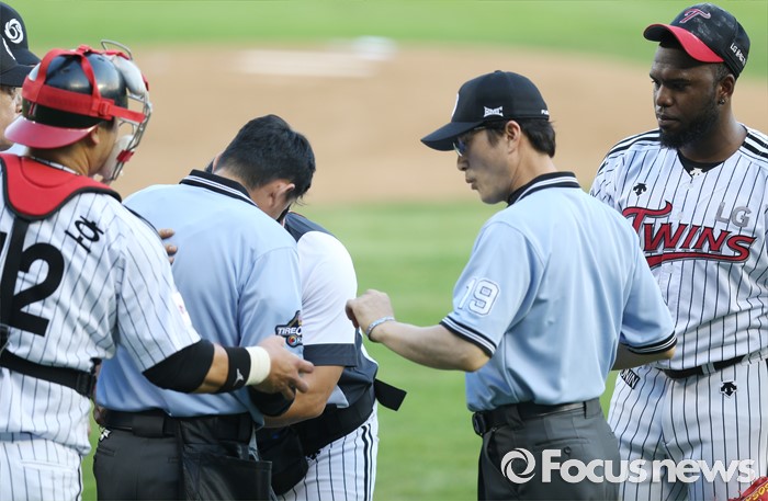 (서울=포커스뉴스) 5일 서울 잠실구장에서 열린 2016 프로야구 kt-LG 경기에서 1회초 파울 타구에 맞은 오훈규 주심이 LG 트레이너에게 치료를 받고 있다.