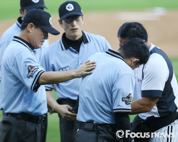 (서울=포커스뉴스) 5일 서울 잠실구장에서 열린 2016 프로야구 kt-LG 경기에서 1회초 오훈규 주심이 kt 이대형의 파울 타구에 왼쪽 어깨를 맞고 LG 트레이너에게 치료를 받고 있다.