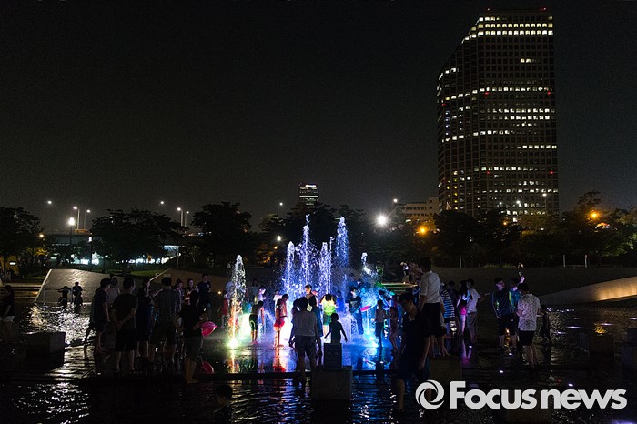 (서울=포커스뉴스) 폭염과 열대야가 지속되고 있는 5일 오후 서울 여의도 한강공원 내 물빛광장을 찾은 시민들이 물놀이를 하며 더위를 식히고 있다.
