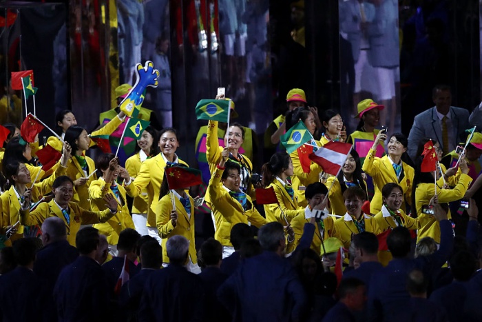 (리우데자네이루/브라질=게티/포커스뉴스) 2016 리우올림픽 개막식이 6일(한국시간) 브라질 리우데자네이루 마라카낭스타디움에서 열렸다. 중국 선수들이 노란 유니폼을 입고 밝은 미소를 지으며 입장하고 있다.