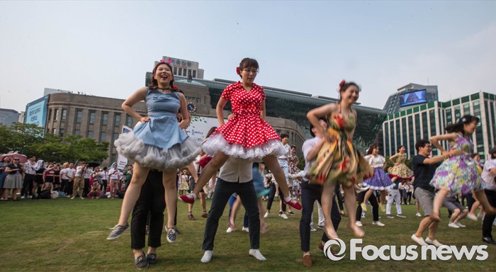 (서울=포커스뉴스) 6일 오후 서울 중구 시청 앞 광장에서 열린 '서울 스윙댄스 페스티벌'에서 청년문화예술단체 딴따라땐스홀 회원들이 음악에 맞춰 스윙댄스를 추고 있다.