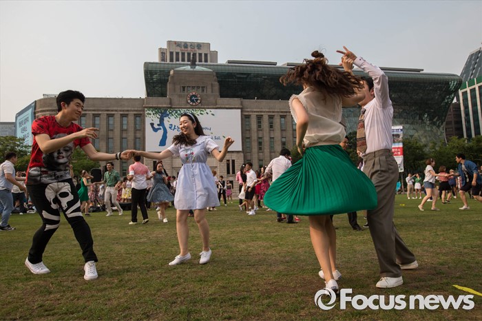 (서울=포커스뉴스) 6일 오후 서울 중구 시청 앞 광장에서 열린 '서울 스윙댄스 페스티벌'에서 청년문화예술단체 딴따라땐스홀 회원들이 음악에 맞춰 스윙댄스를 추고 있다.