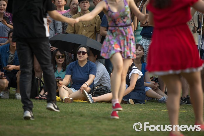 (서울=포커스뉴스) 6일 오후 서울 중구 시청 앞 광장에서 열린 '서울 스윙댄스 페스티벌'에서 청년문화예술단체 딴따라땐스홀 회원들이 음악에 맞춰 스윙댄스를 추고 있다.