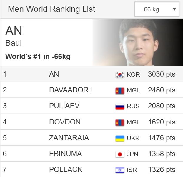 특히 마사시는 2012 런던올림픽 동메달리스트다. -66kg급에서 조준호를 꺾고 4강에 진출했다. 안바울과 마사시는 대진상 준결승에서 만나게 된다. 안바울과 마사시 모두 수준급 기량을 자랑하기에 이변이 없는 한 안바울과 마사시는 4강전은 성사될 것으로 보인다.(도쿄/일본=게티/포커스뉴스) 2014년 유도 그랜드슬램 도쿄에서 안바울이 에비누마 마사시를 상대하고 있다. 2016.08.07 ⓒ게티이미지/이매진스 -66kg급 세계 유도 랭킹 <사진출저=국제유도연맹 공식 홈페이지 캡쳐>